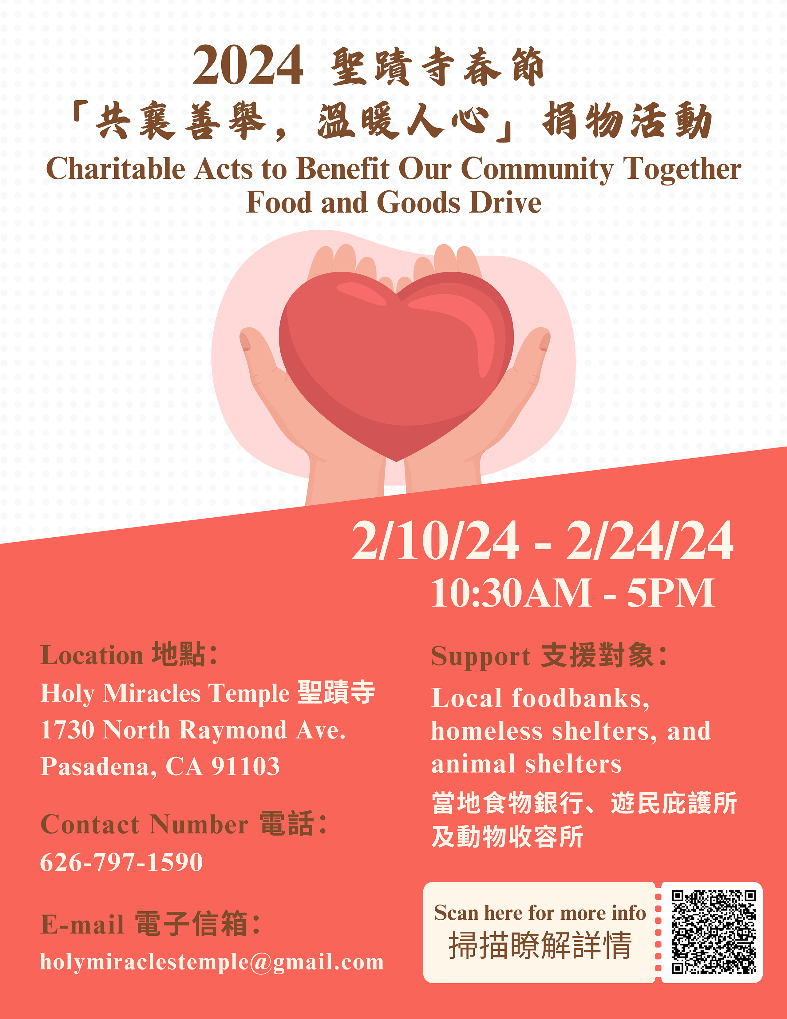 尊奉南無第三世多杰羌佛慈悲利生教導,感念佛菩薩救度眾生大悲恩德,聖蹟寺舉辦春節「共襄善舉,溫暖人心」捐物活動。募得物資將支援【當地食物銀行】、【當地遊民庇護所】及【當地動物收容所】,誠摯邀請您一同送暖植福。
