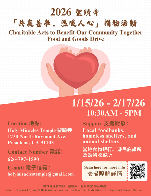 此外,世界佛教總部、聖蹟寺與聖格講堂聯合推動「共襄善舉,溫暖人心」捐物活動,鼓勵信眾將佛陀日的慶祝,轉化為長期守護生命的菩薩行。