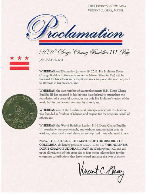 「H.H. 第三世多杰羌佛日」為全球唯一由政府正式頒佈的佛陀紀念日,於2011年由美國華盛頓特區市長 Vincent C. Gray 行文宣佈,以表彰 H.H. 第三世多杰羌佛對人類文明、世界和平與道德精神的深遠貢獻。