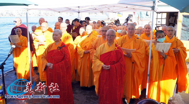 法會以祈願世界和平為共同心願,信眾在法師們的帶領下,依儀將魚類眾生放歸大海,迴向眾生離苦得樂、社會安定祥和。